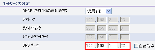 | ※ | ここで入力する「DNS サーバ」のアドレスは、ご利用のパソコンが使用しているアドレスと同じものにする必要があります。 | |