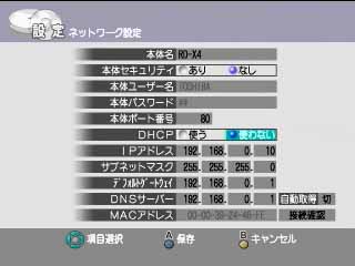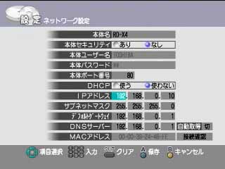 | ★ | 「←↑→↓」ボタンと数字ボタンで「IP アドレス」「サブネットマスク」「デフォルトゲートウェイ」「DNS サーバ」を入力して、「A」ボタンを押します。 | |