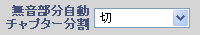 | ● 切: 無音部分でチャプター分割をしません。 ● 入: 音声がない(聴感上音のない)部分で自動的にチャプターを分割します。 ※ この設定はデジタル放送の録画には働きません。 |