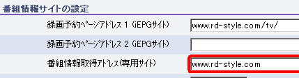 「番組情報サイトの設定」の「番組情報取得アドレス (専用サイト)」に番組情報取得サーバのアドレスを入力します。 |