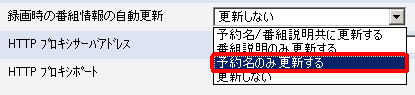 「番組情報サイトの設定」の「録画時の番組情報の自動更新」を「予約名のみ更新する」にすると、予約録画時に予約名のみを自動更新します。 |