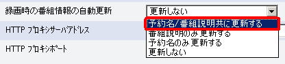「番組情報サイトの設定」の「録画時の番組情報の自動更新」を「予約名/番組説明ともに更新する」にすると、予約録画時に予約名と番組説明を自動更新します。 |